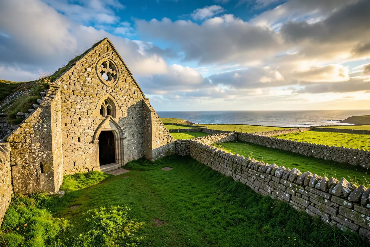 The current stone church structure originated from St. Ciarán of Clonmacnoise’s founding in the 6th century, which established the church’s first building. The place achieves its special quality through two elements: its complete historical preservation and its beautiful coastal setting, which has maintained its traditions for more than 1,400 years.