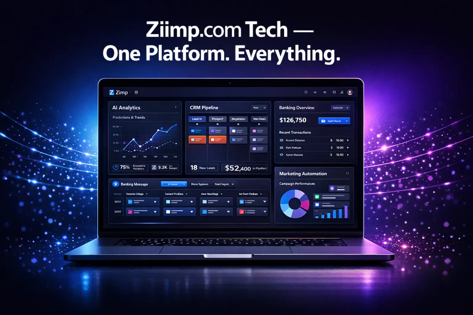 Ziimp.com tech provides a complete digital solution which integrates marketing automation with customer relationship management and core banking systems and artificial intelligence analytics. The platform serves startups and agencies and businesses which require centralized control of their various operations through a single dashboard.